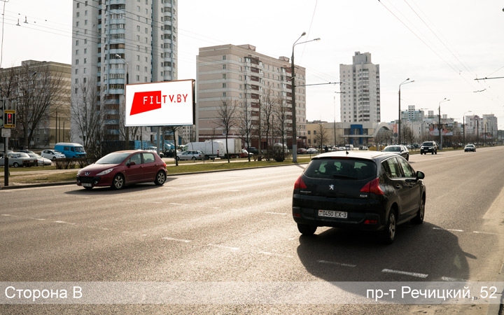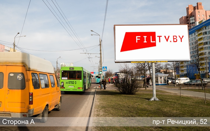 Двусторонний рекламный щит находится на одном из главных городских проспектов, в западной части города Гомеля. Данное месторасположение является очень выгодным по нескольким причинам: крупный микрорайон города с плотной жилой застройкой, эффективное транспортное сообщение (легковой, грузовой и все виды общественного транспорта), перспективное окружение (наличие крупных торговых центров, образовательных учреждений и спортивно-развлекательных объектов). Хорошая обзорность рекламной конструкции и близость регулируемого пешеходного перехода, обеспечит высокое число контактов с Вашим рекламным обращением. Сторона А работает в направлении к центру города.