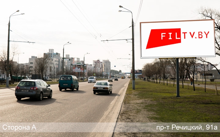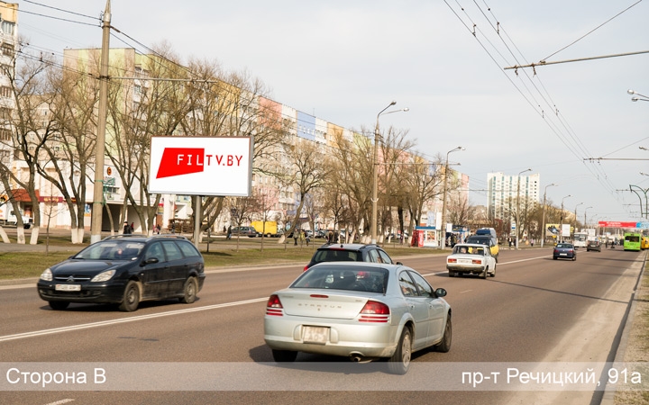 Двусторонний билборд находится на одном из главных городских проспектов, в западной части города Гомеля. Это месторасположение является очень выгодным по нескольким причинам: крупный микрорайон города с плотной жилой застройкой, эффективное транспортное сообщение, перспективное окружение (наличие крупных торговых центров, образовательных учреждений и спортивно-развлекательных объектов). Сторона А работает в направлении выезда из города.